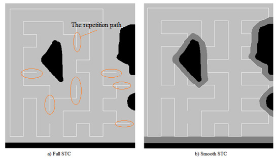 As with the off-line STC algorithm, SSTC will ignore the mega-cells that are partially or wholly occupied by obstacles; therefore, it still carries the limitations of STC. Along with the Full-STC algorithm, the SSTC algorithm ignores only the sub-cells occupied by obstacles and creates a pathway through the remaining free sub-cells. Figure 3 shows the path resulting from the use of the Full-STC algorithm.