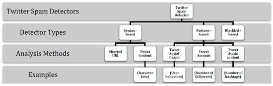 Additionally, the authors in Ref. [27] categorized the methodologies used for detecting Twitter spam into three groups: syntax-based, feature-based, and blacklist-based detection (see Figure 1). Syntax-based detectors analyze a tweet’s content, including linguistic features and shortened URLs, to determine whether the tweet is spam or non-spam. The second group, feature-based detectors, extract a set of statistical features from tweets to help the utilized classifier determine whether the tweet is spam or non-spam. This group uses a combination of techniques: account-based features, tweet-based features, and social graph features. Account-based features include account age and number of followers, while tweet-based features are the number of characters and the number of URLs. To overcome some of the weaknesses of account-based and tweet-based features, some recent studies have found that robustness can be increased by adopting a social graph to detect spam by analyzing mathematical features, such as social distance and connectivity between followers. In the last group—blacklist-based detectors—accounts and tweets are blocked on the basis of users’ feedback or the URL’s reputation. The first study of the effectiveness of some Twitter spam detection techniques that have been used in the past was presented in Ref. [28]. Examples included spam behavior, clickthrough, and blacklists. The authors found that the blacklist methods (for example, Google SafeBrowsing) are too slow at detecting new threats. They found that although 90% of victims visit spam URLs within the first 2 days of receipt, it took 4–20 days for the URLs in spam tweets to be blacklisted. In another study, it was determined that blacklists can protect only a few users, and the authors asserted that studying the regional response rate could improve spam detection [29]. Furthermore, to overcome the limitations of the blacklist, some preliminary studies have used heuristic rules to filter Twitter spam [29].