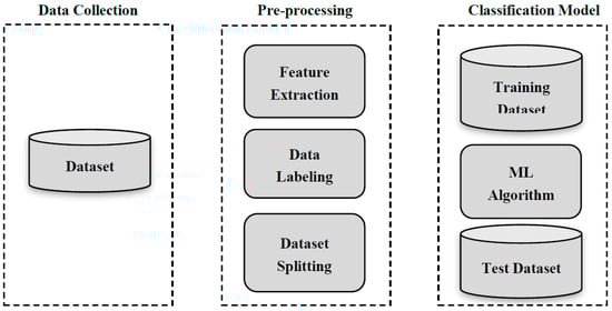 The process of spam detection using ML comprises several steps. The first step involves collecting data from Twitter using its Streaming Application Programming Interference (API). This is followed by data preprocessing, which includes feature extraction, data labeling, and dataset splitting. However, for textual spam detectors, the preprocessing step may include more functions, such as tokenizing, removing stop words, and steaming. Extracting and selecting features from tweets or Twitter accounts helps the chosen ML classifier to distinguish between spam and non-spam. Examples of these features include account age, the number of followers or friends, and the number of characters. Data labeling or ground truth is the process in which the collected data are labeled either manually or using a crowdsourcing site. The dataset then needs to be split into a training set and a test set. The last step entails training the chosen classification algorithm by using the labeled data, followed by performance evaluation, during which the trained machine learning classifier can be used for spam detection [29,30] (see Figure 2).