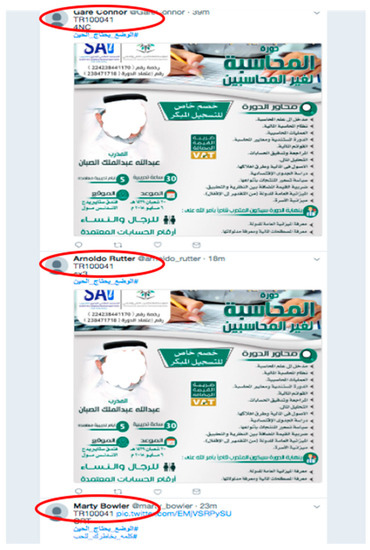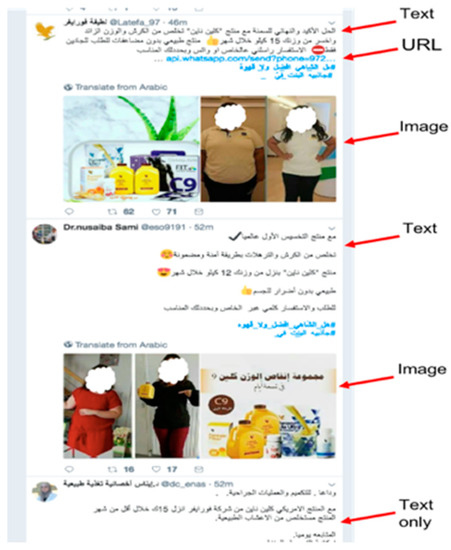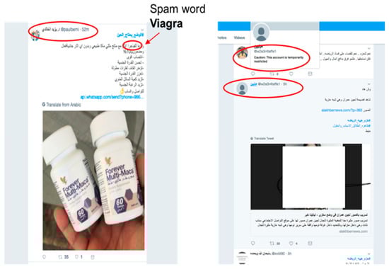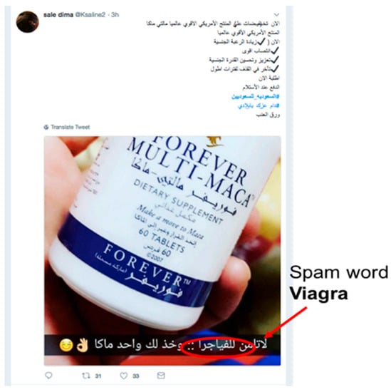 The first appearance of spam on Facebook was in 2008, while the first Twitter spam attack, in which a number of Twitter accounts were hacked to spread advertisements, was in 2009 [5,6]. On Twitter, spammers tweet for several reasons, such as to spread advertisements, disseminate pornography, spread viruses, phishing, or simply compromise a system’s reputation [7]. Furthermore, in Ref. [8], the authors asserted that a tweet is considered spam if it is not composed purely of text. Instead, it contains a hashtag, a mention, a URL, or an image. Various types of spam are found on OSNs, including textual pattern spam [9], image spam [10,11], URL-based spam [12], and phone number-based spam [13]. Whilst most previous studies have focused on detecting the above types of spam, few have attempted to detect advertisement spam. The authors in Ref. [14] categorized adversarial advertisements as counterfeit goods, misleading or inaccurate claims, phishing, arbitrage, and malware. The diversity of spam on OSNs makes it very hard for any single existing method to detect most spam [15]. Several reported incidents reveal the danger of spammers on OSNs. For example, a number of NatWest bank customers were victims of a Twitter-based phishing attack that used spam tweets that looked very similar to those from the official NatWest customer support account [1]. A recent study noted that the increase in OSN spammers, who distribute unsolicited spam and advertise untrustworthy products, affects the public’s perception of companies, which can eventually lead to people developing biased opinions [16].