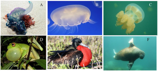 Jellyfish species and animals that have inflatable structures. (A) Portuguese man-of-war, physalia, courtesy of Pixabay GmbH/Alicia Campbell; (B) Moon Jellyfish, Aurelia aurita, photo courtesy of Armita Hamidi; (C) True Jellyfish, Mastigia, photo courtesy of Quin Marshall [30]; (D) Frog, Litoria chloris [31]; (E) Frigatebirds, courtesy of Galapagos Conservation Trust, photographer Martin Partridge; (F) Walrus, Odobenus rosmarus, photo courtesy of Pixabay GmbH/Sven Schlieter.