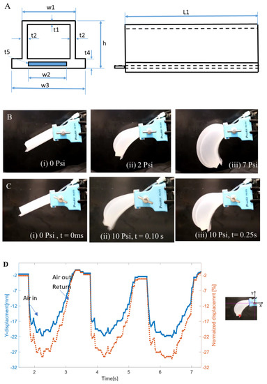 The silicone used for our actuator is Ecoflex-30, which has a shore hardness of 00–30, up to 900% elongation at break, and a tensile strength of 200 psi (1.4 MPa) [33]. The new structure is the use of spring steel (blue rectangle in Figure 2A) as the inextensible layer at the bottom. The advantage of using spring steel is its spring-back effect. When a force is applied to a spring steel on one end and released suddenly, it retracts to its original position quickly. This structure was effective for SMA based systems as well [20]. In our case, the force is applied when compressed air is filled in the chambers. The material of the spring is 1095 blue tempered steel with a thickness of 0.005” (t5 = 127 µm) and a width of 0.5’ (w2 = 12.7 mm). The leaf spring is embedded in a skin silicone. It takes 3–4 hours for the silicone to fully cure under room temperature. A tube for inflation is inserted into the actuator through a nipple extrusion and zip tie is wrapped around the nipple to hold the inserted tube in place. Figure 2B shows the undeformed SPC actuator at the first column followed by the deformed shapes of the actuator at pressure 2 and 7 psi (14 and 48 kPa). Figure 2C shows the inflated structure at different actuation times 0, 0.1 and 0.25 s (video S1, supplementary file, Video S1 FludoJelly1, SPC actuators.mp4). The vertical displacement is 22 mm as shown in the time domain plot in Figure 2D, the left axis. When normalized with the length, the maximum vertical displacement is 28% as shown in the right axis. The negative indicates the direction of bending.