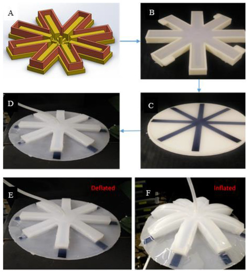 Biomimetics implies the study of anatomy and mechanisms present in nature and creating a model or system using synthetic materials for solving complex engineering problems. This approach is crucial for advancements in science and technology [1]. Soft robotics is one such field, which focuses on replicating the movement of biological creatures using soft synthetic materials. Compared to soft robots, conventional robots have rigid structures that limit their motions. Soft robotics brings in a new dimension of motion due to soft robots’ fluidic movement and many degrees of freedom [2,3,4]. Pneumatic networks (Pneu-Nets) are fluidic actuators, which bend with the help of compressed air [5,6,7], their motion direction can be controlled by changing the design and placement of the inextensible layer. The wall thickness and the size of the chamber affect the motion and the time required to inflate it completely [8,9]. Based on this, many biomimicry related studies and inventions have been made, such as a soft robotic tongue [10], soft robotic manipulators [11], a quadruped [12], an octobot (a soft robot with microfluidic controller) [13], a snake-like robot and a self-contained robotic fish [14]. Soft robotics is not only limited to biomimicry, but also has been extended to wearable devices to help the rehabilitation of physically impaired individuals. Thumb assistance and ankle foot rehabilitation are a few examples of soft wearable devices [15].