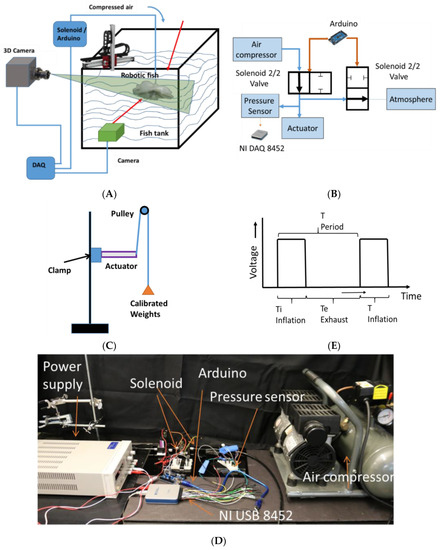 The swimming motion of the robotic jellyfish was tested using different cameras while the robot was tethered underwater as shown in the schematic diagram in Figure 4A. These cameras were used for characterizing and verifying the motions with different measurement conditions and at different frame rates. A pressure control circuit was made to control the actuators as shown in the schematic diagram in Figure 4B and the photograph of the setup is shown in Figure 4D. The air compressor used here is single stage air compressor (California Air tools Model no. 202977393) which can generate a maximum pressure of 120 psi. Solenoid valves (STC 2P025) were used to direct the air flow in the pneumatic circuit, the valves were 2/2 valves and required a 12 V power supply. An external DC power source was used to provide the required voltage. A MOSFET was used to act as a switch and energizing the solenoid. A pressure sensor (Honeywell-ASDX AVX030PG2A5) was also installed in the circuit for pressure readings. The data from the pressure sensor was collected from a National Instruments data acquisition unit NI USB 8452 through LabVIEW program. The pressure sensor used here is an I2C network interface digital output sensor.