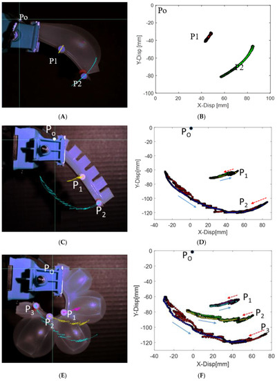 Actuators and their XY trajectories: (A,B) Actuator 1 with single chamber and spring steel, (C,D) Actuator 2 with multiple chambers and two point tracked, (E,F) Actuator 2 with multiple chambers when three points are tracked along the edge.