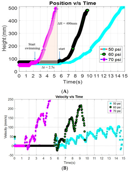 Tracking the position (A) and velocity (B) of the prototype FludoJelly at different pressure 50, 60 and 70 psi while carrying a dead weight of 100 gram.