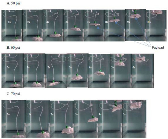 Photograph of the robot while swimming carrying 100 g load at different supply pressure (50(A), 60(B) and 70 psi(C)) using fast camera for motion capture. All the photos were taken at 1 s intervals after it start moving.