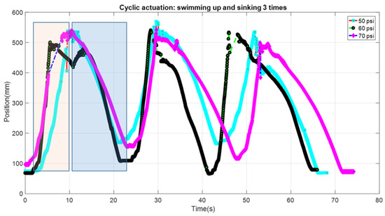 To check the cyclic motion of the robot, tests were done by supplying constant pressure (50, 60 and 70 psi) with 100 g payload and controlling duration. The pulse period was 20% duty cycle at 0.8 Hz frequency (250 ms on and 1000 ms off). The experiment was done as follows. The pulse pressure was given until the prototype reached to the top of the fish tank. Once it reached the top, the supply pressure was stopped allowing the prototype to sink. When it reached to the bottom of the tank, another cycle of the pulse was provided, and this process was done three times. The results for the three different cyclic pressures obtained from the tracking software are shown in Figure 9. Video of the test is also provided as supplementary information (Video S3 Cyclic Swimming FludoJelly 60 psi 1X.mp4). As can be seen in the figure, the effective height of 400 mm was obtained for all three cycles and the frequency of swimming up and sinking down (one complete cycle) was 0.05 Hz. The rising phase (orange shaded region in Figure 9) is the powered cycle due to the pulse air pressure and the downward (blue region) is the sinking phase due to the attached weight, thereby making the sinking-down cycle longer.