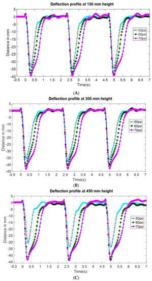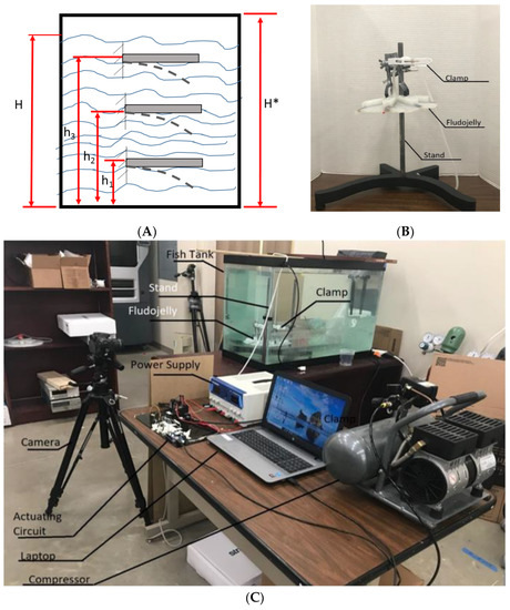 From Figure 10A, we have H* which represents the total height of the fish tank, 635 mm. H represents the total water level height, ~560 mm. The heights where the FludoJelly was clamped in the fish tank during experiment were , and . Therefore, the pressure at height h1 is which is less as compared to pressure acting at height and . Since the quantity ( increases from to , the pressure increases as we go down in the fish tank. Hence, due to the increase in pressure, less deflection is seen at the bottom position as compared to the top ones. This was observed in the experimental results in Figure 11. We noticed that the applied pressure (50–70 psi, equivalent to 3.45 × 105–4.83 × 105 Pa) are much higher than the pressure due to the water height, which is decreasing as the height increase (left axis of Figure 12B). The maximum pressure is 4 × 103 Pa, which is 100 times less than the applied pressure. Therefore, the height is not the dominant factor in the fish tank experiment.
