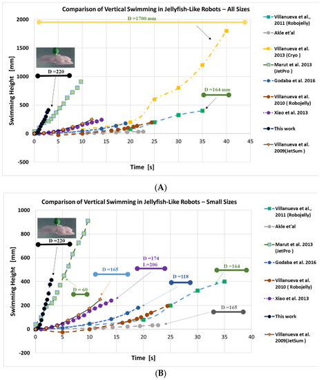 Comparison of swimming jellyfish-like biomimetic soft robots. In the top graph (A) we have compared with other prototypes in the literature. In the bottom graph (B) we have excluded Cryo (2013) to obtain a zoomed version of the graph. All dimensions are in mm and the arrow lines depict the size of the robots. (Note: vertical movement vs time data of some jellyfish-like robots are not available or missing in publications, and therefore are not plotted here).