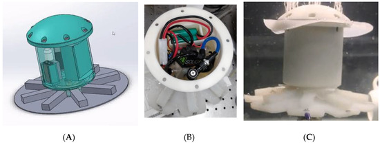 Self-contained structure for FludoJelly: (A) CAD design of the self-contained design, (B) the prototype with circuits, battery, CO2 cylinder and electronics housed in the main body and (C) test in water of the self-contained jellyfish.
