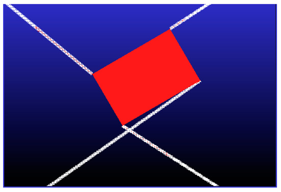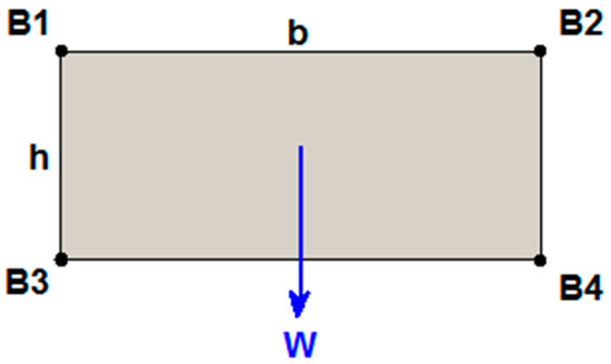 - Case 1: A four-cable planar CDPR with 3-DoF and an EE with rectangular geometry where cables are attached at fixed anchor points on the EE. In this configuration, the cables cannot collide with the EE during a rotation, so the only forces acting on the cables are tension forces. Figure 1 shows the EE with the classical rectangular geometry, where the measurements of the mobile structure are: