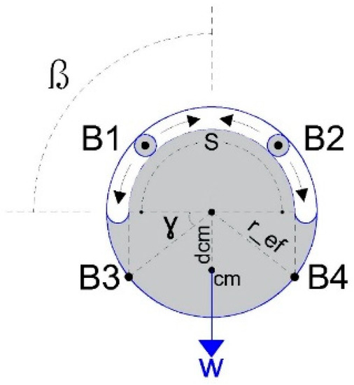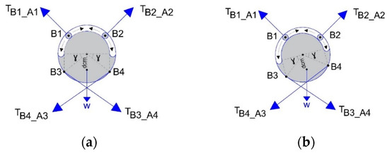 The equilibrium of the forces along the x and y axes is represented by Equations (3) and (4), respectively. When calculating the tension components and , the unity vector is assumed to extend from the centroids and to points A1 and A2, respectively, provided that neither B1 nor B2 reaches the maximum value β. If point B1 or B2 reaches β, they will be treated as fixed points. The unity vectors extending from points B1 or B2 are described as and , respectively.