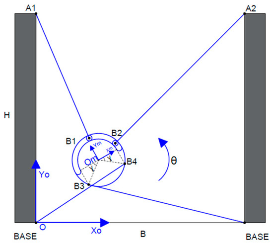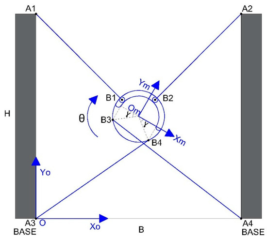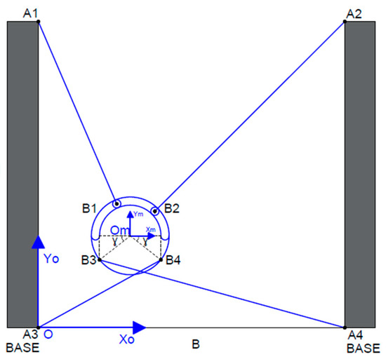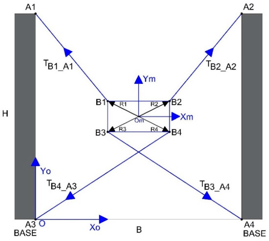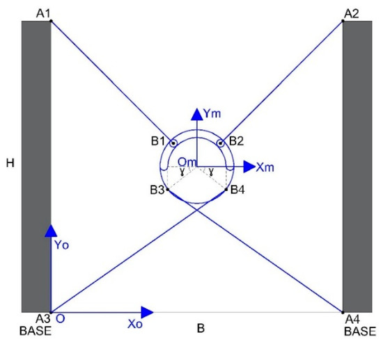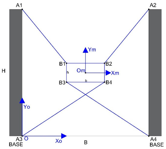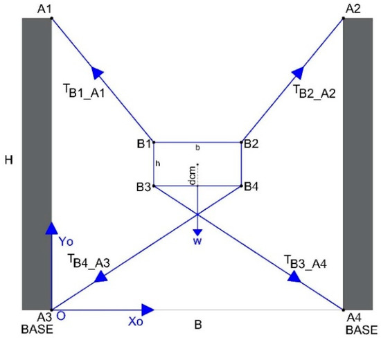 Figure 4 shows the mechanical structure, cable disposition, and links to the fixed points and the moving platform in case 1. The nomenclature in this case is listed below: