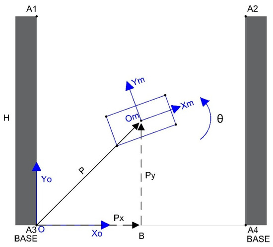 As described in case 1, the fixed and mobile coordinate systems are denoted as (Xo, Yo) and (Xm, Ym), respectively. The horizontal and vertical movements of the mobile platform are specified as Px and Py, respectively. The effector is oriented through angle θ around the axis perpendicular to the xy plane, as shown in Figure 12.