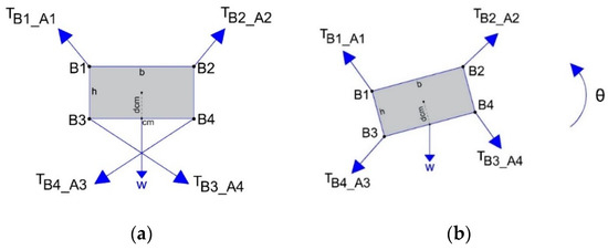In this case, the system of equations describing the motion and rotational equilibrium must consider the forces acting on the upper cables. These forces act along the line from the centroid to the fixed points where the cables are attached. Recall also that the center-of-mass of the EE is displaced (see Figure 10).