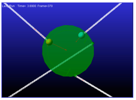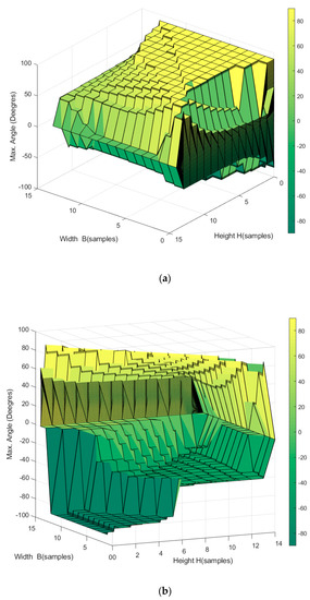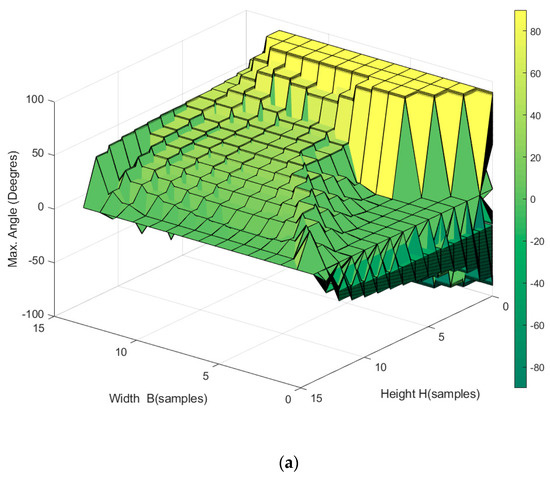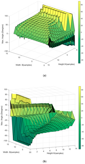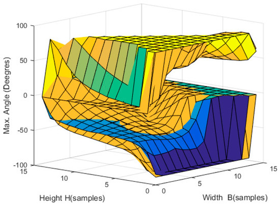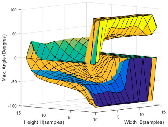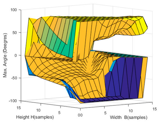 In the simulation, the tension in the cables was gradually increased, and the maximum angle through which the EE could turn without exceeding the established maximum force in the cables (in this case, 200 N) was determined. Because the aim was to check the orientation of the robot, the robot’s position was fixed in the center of the workspace.