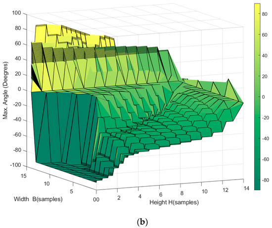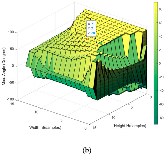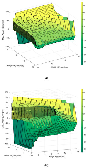 Orientation workspace of the planar CDPR with 3-DoF and a rectangular-geometry EE, (a) top view showing positive rotation angles, and (b) bottom view showing negative rotation angles.
