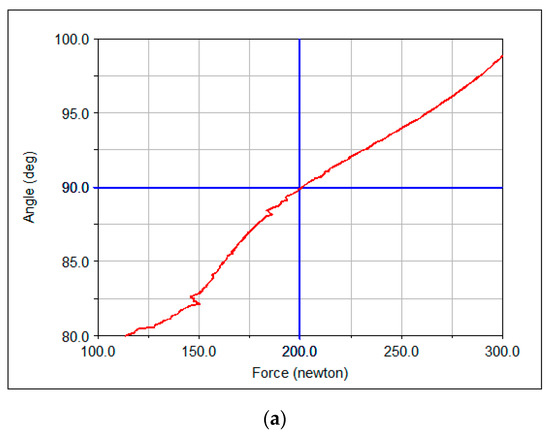 The rotation angle reached by the robot without exceeding the maximum tension in the cables of 200 N was 89.9° (Figure 25). These results agree with the MATLAB analysis in Figure 16, which is reproduced in Figure 25b for a better comparison. At the central position of the robot, the maximum orientation in the MATLAB analysis was around 80°, close to the value of 89.9° obtained in the ADAMS simulation and coincident with the ADAMS simulation.
