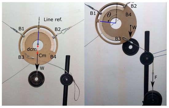 The real experimental test was developed in order to demonstrate the maximum rotation angles. Due to the low characteristics of the prototype materials, the proportional forces that are used are smaller than what was treated in the investigation. In the experiment it was considered a weight, W (suspended mass of 1 kg) that was applied to the center of the mass (Cm). B3 is the anchor point, the indirect force F (suspended mass of 4 kg) was developed. The robot was centralized in its workspace position again, and the sliding surface of the mobile points had a physical restricted of 120°.