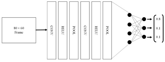 Since the network architecture is based on AlexNet, the number of layers, number of filters, receptive field, stride, and activation can be based on the already tested and proven neural network by Krizhevsky et al. The input and output size were decided for the application and was chosen to be 80 × 60 (image width × height) with one channel (grayscale frames) and three output neurons as discussed above. The learning rate was set to 0.0001 and the batch size used to calculate the gradient of the cost function was set to 32. The number of training epochs cannot be determined easily as it depends on the size of the network and the amount of training samples that are available. For training the neural network, an Adam optimizer [33] was decided upon as it is widely used and the convergence is much faster when compared to a stochastic gradient decent. During training, the dataset is split into training and test sample sets with a test sample size of 500. Although a validation set is a useful method to assess how the training is progressing, it was not implemented in this case for fear that a further reduction in the training data set would result in overfitting.