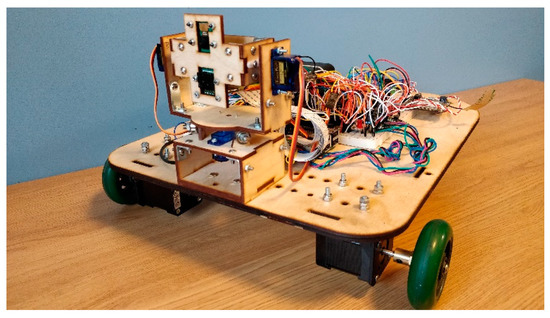 The robot was controlled by an Arduino Mega 2560 microcontroller (Rapid Electronics Limited, Colchester, UK) and a Raspberry Pi 3 Model B (Premier Farnell, Leeds, UK) single board computer (SBC), which was connected to a laptop by a wireless network on which the controlling neural network was being run. The robot used stepper motors for locomotion, which were arranged in a differential configuration and were controlled by the Arduino using commands from the Raspberry Pi. These motors are good for environments where there might be flammable gases present. The stepper motors used for this project were NEMA 17 bipolar stepper motors (17HS19-0854S, OMC Corporation Limited, Nanjing City, China), which run on 5.3 V at 0.85 A per phase. To drive each stepper motor, a Pololu DRV8834 (Hobbytronics Limited, York, UK) was used. Sixteen-bit timers in the Arduino MEGA 2560 were used to control the step frequency and hence control the rpm of the wheels. The motors were powered using an Anker PowerCore 20,100 (Amazon, Seattle, WA, US) battery bank. A separate battery bank was used to power the remaining electronics. The robot was able to stay mobile for at least 2.5 h using these banks. The main parameters used for the robot are summarized in Table A1.