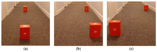 Various scenarios for the corridor obstacle test with boxes being (a) centered, (b) off-center to one side, and (c) off-center both sides.