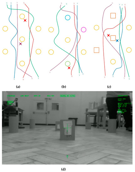(a) The course used to train and test the neural network, where positions X and Y correspond to the start and end positions, respectively; (b) variation of (a) with different-colored obstacles used for testing; (c) variation of (a) with different-shaped/looking obstacles used for testing; (d) captured image showing the different appearance of the obstacles used in (c).