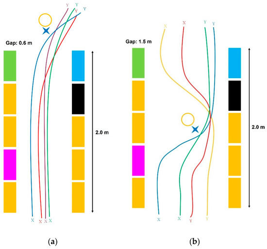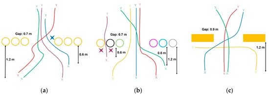 (a) Results for the basic gate test, where positions X and Y correspond to the start and end positions, respectively; (b) results for the color gate test; and (c) results for the lying obstacle gate test.