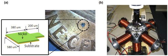 (a) Micro-scale magnetostrictive asymmetric thin film Bimorph (MAB) microrobot and (b) the magnetic field system used to actuate these microrobots. (Images reproduced with permission from [46,47]).