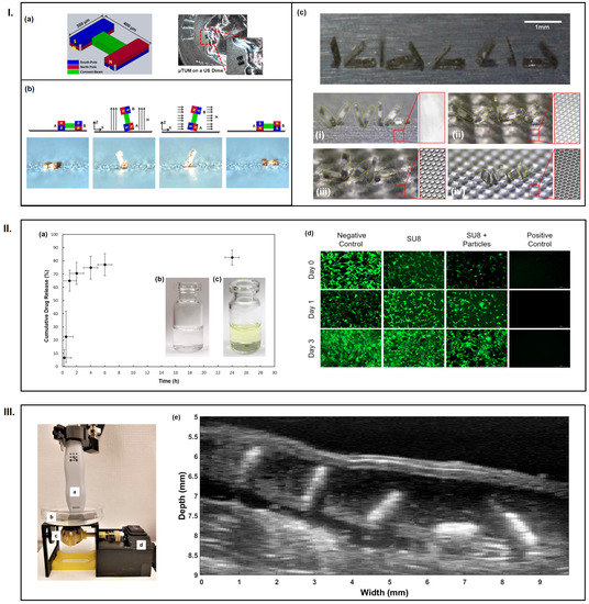 In order to be used for such biomedical applications as desired, it is imperative that the materials the microrobot is made out are biocompatible. To assess the short-term cytotoxicity of the doped SU-8 used to fabricate the TUM, cells were put in contact with both SU-8 and SU-8 with magnetic particles and studied for a few days. The cell proliferation on these materials was compared to a positive and negative control. Figure 3II-d shows the results of the cytotoxicity tests, and it is shown that both the SU-8 and the SU-8 with magnetic particles allow for the proliferation of cells, which means they are biocompatible.