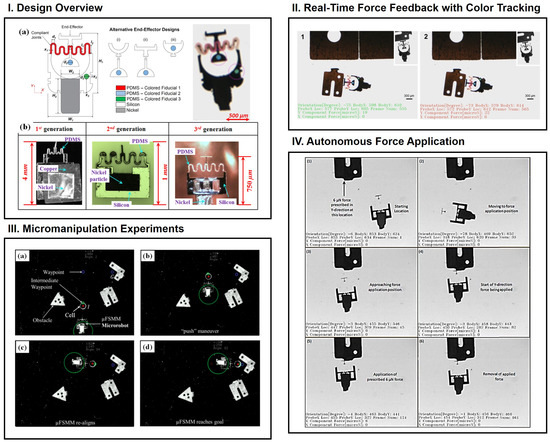 I. Design overview: (a) schematic and image of the most recent micro-force sensing magnetic microrobot (FSMM) design (with colored fiducials for tracking), and (b) evolution of the microrobot’s design, showing the significant miniaturization of the footprint. II. Real-time force feedback with color tracking: experiments demonstrating real-time force feedback to the user while pushing a micro-block. III. Micromanipulation experiments: automated manipulation of cell with real-time force sensing using the FSMM (a–d) showing automatic re-alignment (c). IV. Autonomous force application: automated pushing with a prescribed force at a desired location. (Images reproduced with permission from [57,58]).