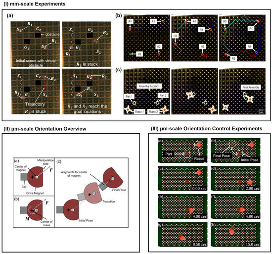 I. mm-Scale experiments: (a) Demonstration of independent autonomous navigation of two robots with the mm scale 8 × 8 coil array [70], and (b) independent control of four robots (R1, R2, R3, and R4) in which they move clockwise towards the starting position of the next robot. (c) Two-robot assembly task, in which each robot is fitted with a 3D printed end-effector and moves a part to the assembly location. II. -Scale orientation overview: (a) robot used for orientation control, with drive magnet and aligned tail cube magnet opposite to the manipulation side of the robot; (b) equivalent force-moment couple for force shown in (a); (c) sample path of a robot showing the changes in orientation. III. -Scale orientation control experiments: micromanipulation of a part using orientation control to change its final position and pose (a–h). (Images reproduced with permission from: [71,73] (II-III © 2019 IEEE)).