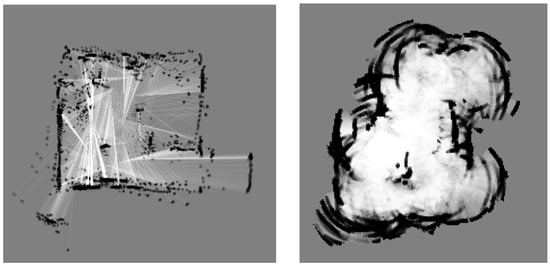 - Metric maps (see Figure 3a) [2,3,6,10,13,14,15,16,17,18,19,20,52,53,54]. These maps describe the geometric properties of the environment. Occupancy grids are the most common metric grid map type, and they represent the map as arrays, where each cell’s value shows the probability that the corresponding area in the environment is free or occupied with obstacle [63].
