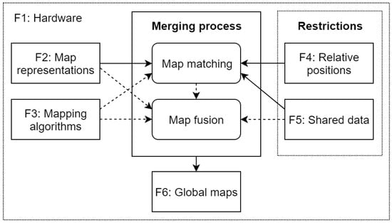 - Robot hardware. Does the robot hardware support map merging? Is it possible to exchange the data, is the processing capability adequate, do sensors support the acquisition of the necessary data (e.g., relative positions of the robots)? These considerations must be taken into account at least indirectly through other factors (through the map representation, relative positioning information, shared data).