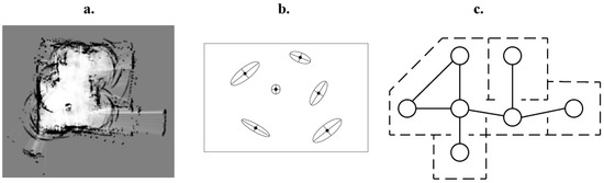 - Graph-based maps (see Figure 3c) [5,6,11,12,42]. These maps represent the environment as a graph, where the nodes represent the environment locations and the edges are paths or constraints between these locations. For topological maps, the link connecting two locations shows that the robot can move between these two places without traversing any other significant locations. Topological maps lack the geometrical information density of metric maps, but require relatively low memory and significantly simplify the path planning task [64]. Pose graph and hybrid-topological maps are also included in this category.