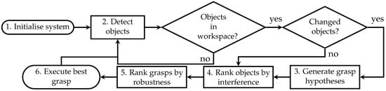 - Rank grasps by robustness: Among the interference-free objects, the best grasp pose is chosen according to a criterion referred to as the robustness of static equilibrium [10].