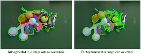 - Object segmentation: The above method only works when the objects are scattered over the workspace. When the objects overlap, the algorithm perceives them as one single object. To distinguish between overlapping objects, a watershed algorithm is applied as an additional step in the object extraction, providing a segmentation (see Figure 3). Due to the dependency on grayscale images, the algorithm tends to result in over segmentation of objects composed of multiple colours. This does affect the success rate of the algorithm, as there is an increased risk of detecting small objects where none exists. On the other hand, under-segmentation brings the risk of conflating neighbouring objects. This often leads to failed grasps when they are attempted near the interface between the two objects that are detected as one. There appears to be a trade-off between over- and under-segmentation, and we found empirically that some over-segmentation gave the best results, although the vision system was still susceptible to some errors.