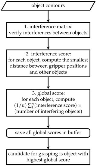 - Global score: The interference score of each object is averaged and multiplied by the number of interfering objects (the interference matrix). For exemple, an object with five grasping hypotheses surrounded by three objects will have the interference score averaged on the five grasping hypotheses and multiplied by three, the number of interfering objects. The objective of this calculation is to maximize the global score of the objects that can provide more space.
