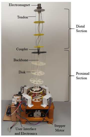 The second (distal) section consists of a 0.95 cm diameter piece of LDPE, segmented by four 3D-printed polylactic acid (PLA) disks (7.62 cm diameter) each spaced 7.62 cm apart. It is joined to the proximal section by a metal coupler. The tendons of the distal section also run though the disks of the proximal section, such that each disk in the proximal section has eight tendons running through it, whereas each disk in the distal section has four tendons running through it.