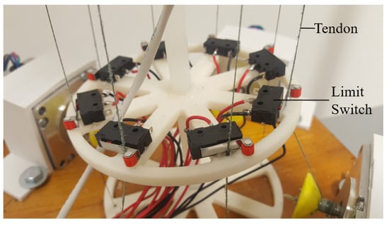 Clicking down on the right joystick (or either joystick in Dual control) causes the robot to return to its ‘home’ position, i.e., pointing straight upwards (the robot is shown in its home position in Figure 1). This mechanism will henceforth be referred to as the re-centering protocol. During regular operation, the micro-controller keeps track of the robot’s position by counting the number of steps sent to each stepper motor. When the re-centering protocol is executed, each stepper motor is driven back to its starting position (which means that the robot must be started in its home position for the re-centering protocol to work properly). The limit switches attached to the robot’s second disk (see Figure 2) serve the purpose of removing any slack that has developed in the tendons during operation. They are mounted such that the switch is depressed (closed) only when the tendon is taut. After the re-centering protocol is executed, if any of the switches are open, the motor controlling the corresponding tendon will coil that tendon until the switch is closed.