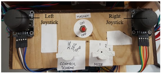 Bendy ARM is teleoperated via a user interface connected directly to the robot (see Figure 3). The control panel consists of two joysticks and three switches. The user is able to operate the robot using one of three control schemes: Dual-Joystick, Single-Joystick Segmented, and Single-Joystick Compensative. Each of these control schemes are open-loop, making use of direct user observation and manipulation for course correction. This helps compensate for the effects of payload and other positional errors without the use of a more sophisticated, computationally intensive control algorithm.