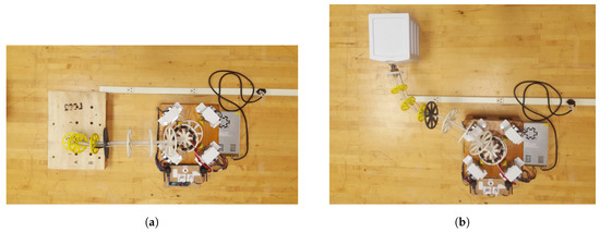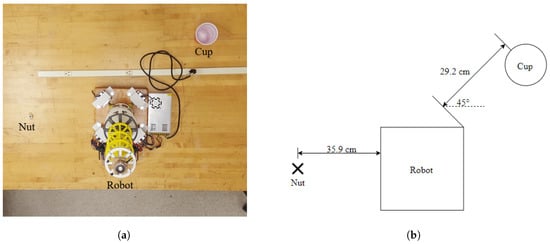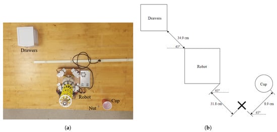 In Round One of testing, 14 able-bodied users—eight males and six females between 16 and 58 years old—were introduced to three different control schemes and asked to complete a given task three separate times, using each control scheme once. The majority of the users had never been introduced to the prototype, or continuum arms in general, so the task was designed to be simple. The setup consisted of a metal nut placed straight out from the left side of the robot’s wooden base, and a cup secured at a position off the back right foot of the base (see Figure 4a,b). The task itself entailed simply retrieving the nut using the electromagnet attached to the end of the manipulator (see Figure 1) and dropping it into the cup on the other side of the robot’s base.