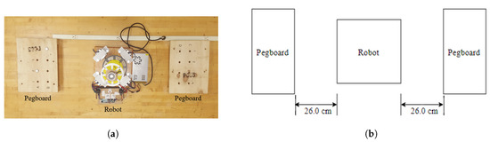 The peg-in-hole task was designed to test the user’s ability to fine-tune the position of the robot’s end-effector. Two pegboards were used for this task, each with a 2 × 4 grid of diameter holes. They were placed symmetrically on the left and right sides of the robot (see Figure 5). The task itself consisted of using the robot and attached electromagnet to move metal bolts from one hole to another. First, the user was required to move a bolt from one hole to a different hole on the same board. Then, they moved a second bolt from a hole on the first board to a hole on the second board. The starting and target holes were systematically varied for every trial to ensure that each trial was different but had the same level of difficulty. Introducing variation in each trial was important for ensuring that any measured improvements in task performance were the result of increased proficiency in controlling the robot, rather than memorizing a systematic strategy for accomplishing one invariant task.