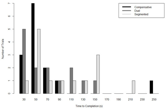 Figure 7 shows a histogram of completion times for each control scheme. It can be seen that users were able to complete the task in under 90 seconds using Compensative control in all but one case, where a user took 240.6 seconds to complete the task. In contrast, a non-trivial number of users required more than 90 seconds to complete the task for both Dual and Segmented control (4 and 5 users, respectively). This histogram provides support for the claim that subjects were most effective using Compensative control, despite large standard deviations in the data.