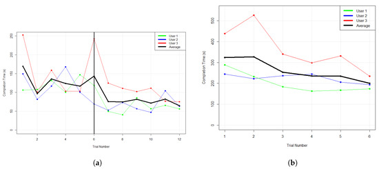 Figure 8 shows results from Round Two of user testing on a trial-by-trial basis. Note that Figure 8a, depicts a significant drop in average completion time between the first six trials and the last six trials. Additionally, there is much less trial-to-trial variation in the last six trials than the first six trials. These trends may suggest that users spend a certain amount of time learning how to complete a task before they achieve proficiency, at which point they are able to complete the task relatively quickly on a consistent basis.