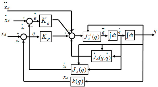 If and are positive definite matrices, the system is asymptotically stable and the error converges to zero with a rate that depends on the eigenvalues of matrices and . The block diagram of the traditional inverse kinematics (TIK) algorithm is depicted in Figure 1.