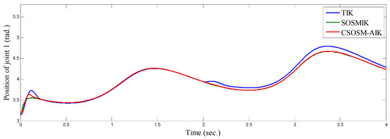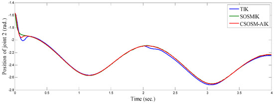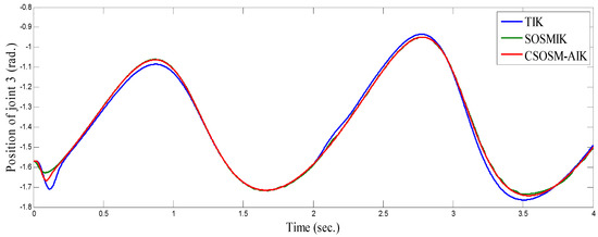 Figure 22, Figure 23 and Figure 24 illustrate the resulting position trajectories for joint 1, 2 and 3 respectively. Figure 25, Figure 26 and Figure 27 depict the tracking position errors in the X, Y and Z coordinates respectively. The resulting tracking position trajectories in in the X, Y and Z coordinates are shown in Figure 28, Figure 29 and Figure 30 respectively. The trajectory of the end-effector is shown in Figure 31. A comparison of tracking response characteristics of all presented inverse kinematics methodologies is shown in Table 4. The integral of the absolute error (IAE) and the integral of time-weighted absolute error (ITAE) are used as two performance metrics. It is obvious from Table 4 that the proposed continuous second order sliding mode -based adaptive inverse kinematics strategy (CSOSM-AIK) provides a superior trajectory tracking performance with a very small error.