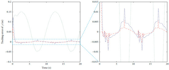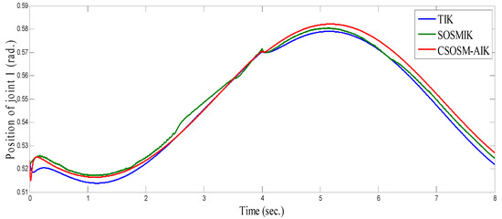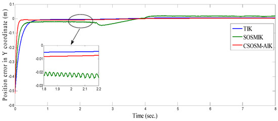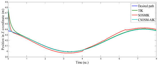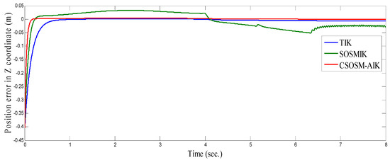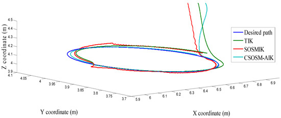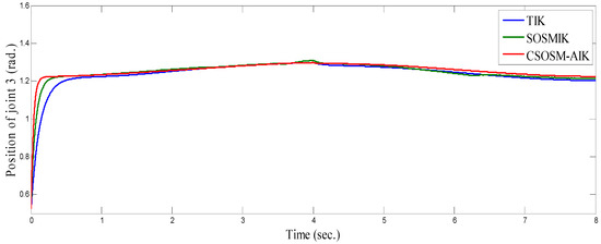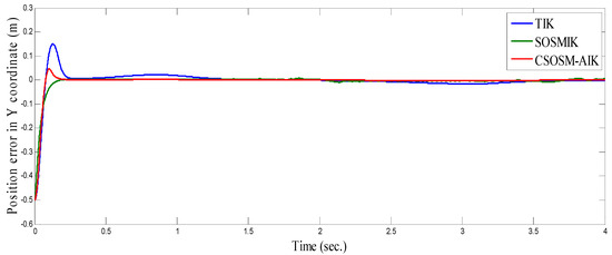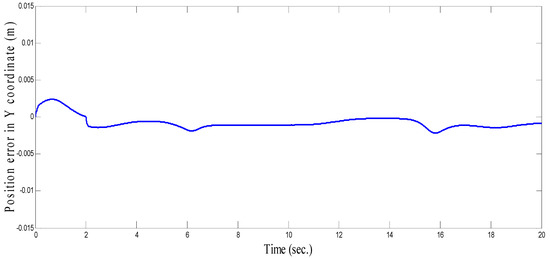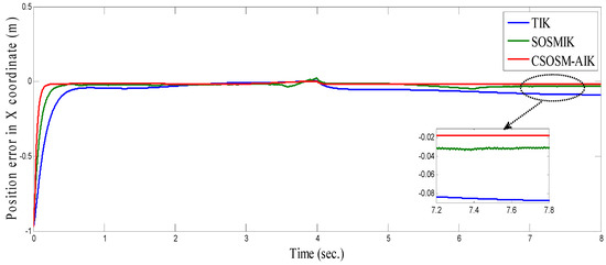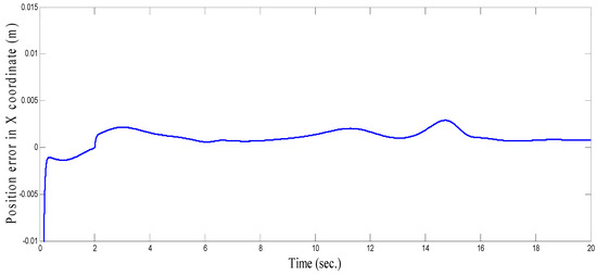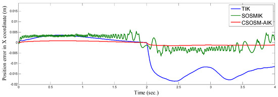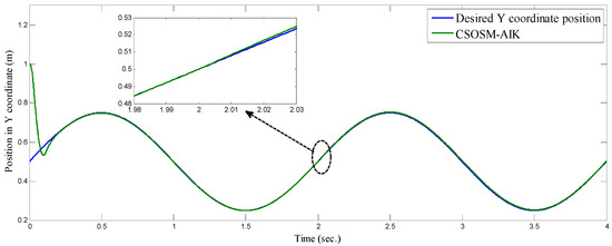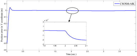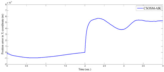 As seen in Figure 36 and Figure 37 for the work proposed in [40], the tracking position errors ranges from approximately −0.01 to 0.01 m while as seen in Figure 38 and Figure 39 (the proposed approach), the tracking position errors ranges from approximately −0.002 to 0.002 m. Thus, the proposed CSOSM-AIK approach can proficiently fulfill the trajectory tracking performance.