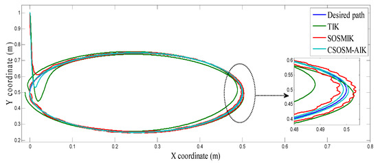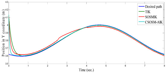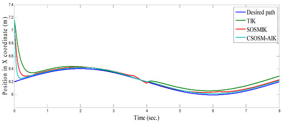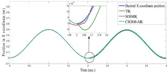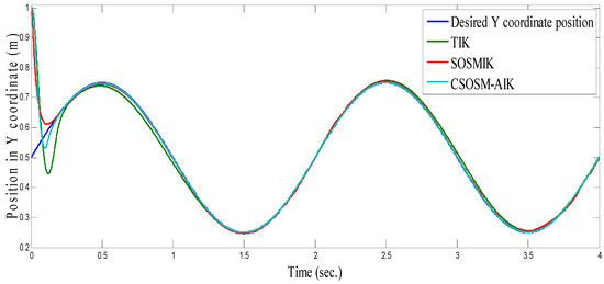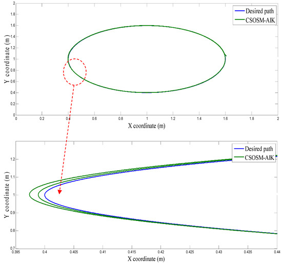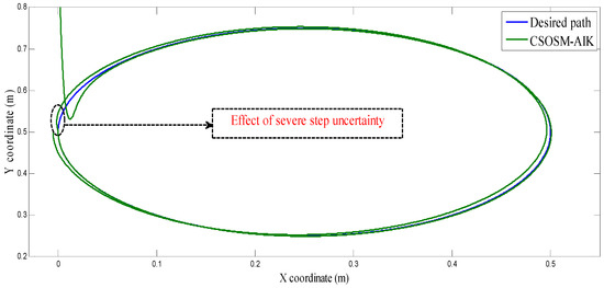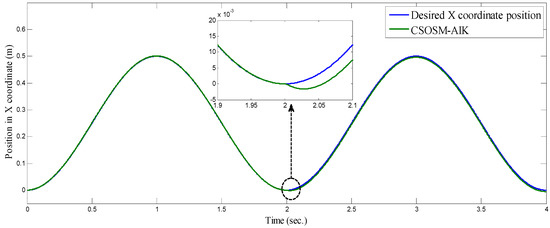On the other hand, the trajectory of the end-effector in the case of our proposed methodology CSOSM-AIK is shown in Figure 37. Also, the tracking error in X and Y coordinates are shown in Figure 38 and Figure 39.